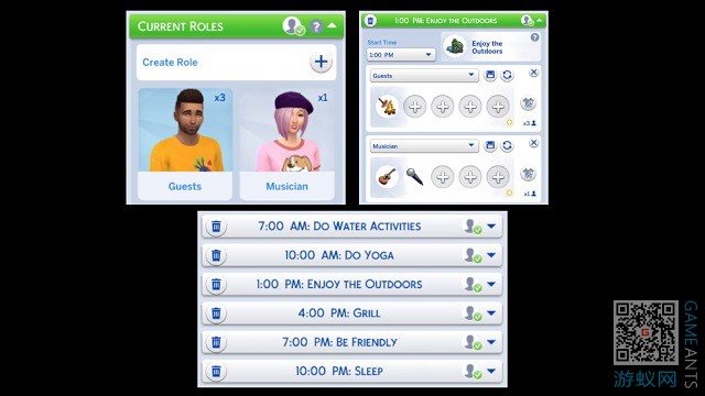 原文地址:《冒险启程》度假与自定义场地指南 —————————————————————————————————————————————— 度假功能隆重登场 嗨,我是《The Sims 4 冒险启程》资料片的专项制作人Soo。今天,我们将带各位提前了解本次资料片中两大激动人心的新功能:度假和自定义场地!我最喜欢《The Sims》的一点,就是每一项新功能都让玩家有机会讲述自己的故事。借助度假功能,我们的团队得以深化故事情节,同时保留《The Sims》的乐趣所在——自由、创意以及适度的挑战和混乱。 嗨,我是度假和自定义场地的首席设计师Nikhil。 我一直都很欣赏那些能给玩家提供强大创意工具的游戏。随着《冒险启程》和度假系统的推出,我们为《The Sims》的多日体验带来了全新维度的自定义功能。我们的团队非常兴奋,能通过日程、角色、活动和规则等功能,赋予打造专属度假体验的自由——我们已经迫不及待地想看到你们创造的各种富有创意的惊喜了! 让我们一起深入探索这些新功能吧! 什么是度假? 在《The Sims 4》中,“度假”包含丰富的形式。从字面上说,它可以让你的模拟市民逃离日常生活,与其他模拟市民一同在新的地点居住,并通过活动日程来引导他们每天的安排。度假可以是让模拟市民共同培养技能的营地,也可以是模拟市民专注于发展人际关系或开展创意性追求的静修营。但度假也可以是去奶奶家度过一个周末,甚至是每周进行的健身课程。你可以把自己的家变为完美的度假基地,邀请一群模拟市民入住你的居所。 什么是自定义场地? 自定义场地是一种全新地段,它突破了博物馆等标准地段的局限,让玩家得以自行设计整个体验。使用场地建造功能,你可以为模拟市民设置规则和角色。当然,如果你想专注于构建世界,依然可以不通过度假系统享受自定义场地的乐趣。不擅长建造,但仍希望体验新的自定义场地?不妨前往模拟工坊获得灵感! —————————————————————————————————————————————— 我应该打造什么样的度假之旅? · 在计划一次真正的冒险时,你可能会问自己: · 我想要去哪里? · 我希望与谁同行? · 我们要进行哪些活动? · 度假安排在什么时候? · 最重要的是问问自己:为什么要去那里? 你可能知道其中一些问题的答案,而当你开始回答某个问题时,其他答案也会逐渐变得清晰。我们希望你能从激发你灵感的那个问题开始设计度假。从一个想法(可以是一个地点、一个目标,甚至只是一种氛围)开始,然后逐步打造完整的体验。这将是你在模拟世界中创造的模拟生活! 玩家的故事:海滩篝火夜 让我们来看看度假系统将如何为你提供各种选择,帮助你在游戏中构建拥有“人物、内容、时间和地点”的完整体验。 至于“原因”这一要素,意味着你需要去探寻自己的动机,为何要让你的模拟市民尝试新事物,创造你自己的故事情节,打破一些规则或是接受新的挑战。 “我想要去哪里?” · 我想去沙滩。 “我希望与谁同行?” · 我想和朋友们一起去,但我也想结识新朋友。 “度假安排在什么时候?” · 我希望度假至少持续4天。可谁说得准呢?也许我会一次又一次地延长行程…… “我们要在度假时做什么?” · 我不想整日开派对或无所事事,我想通过游泳和潜水来健身,或者早点起床练习晨间瑜伽。 · 我想围着海边的篝火跳舞,甚至当个音乐家。 “该给这次度假起个什么样的代号?” · 就叫它“海滩篝火夜”吧! “我的模拟市民为什么要来这里?” · 我们想和朋友共度一段休闲的海边假期,一起体验各种事物,结交新朋友,培养新技能,放松身心并欣赏美景。 微小的变动也会彻底重塑度假体验 · 随着本次度假的展开,试想一下,如果我们对这些问题的回答稍作修改: · 如果本次海滩度假的目的是让模拟市民塑造完美体型,然后一争高下,看看谁才是最强健的模拟市民呢?如果我们把比赛改为寻觅爱情呢? · 如果下一轮的海滩度假是让情侣们重返此地,修复他们紧张的关系,或者干脆放弃并寻找新的恋情呢? · 如果我们移除工作人员、教练以及其他辅助模拟市民,而海滩游客必须依靠周围的自然环境捕鱼、烹饪、打扫并自食其力,该怎么办? · 如果你买下这个地段,通过让游客住在这里享受豪华别墅体验来赚钱呢? · 有了度假系统,你可以将一个初始想法发展成完全不同的内容。 —————————————————————————————————————————————— 度假功能的构成要素 在创建一次度假之旅时,你将使用5个相互协作的核心构成要素:角色、日程、地点、活动和规则。 日程、角色和活动是你作为度假之旅创建者的最强工具。你设置的地段(包括一个你可以确定行为模式的自定义场所)让你能够自主管理一个地点,制作从原始生存训练营到奢华豪宅的任何场景。而度假规则则让你能够加入竞争和挑战元素以及特殊玩法层次,为你的模拟市民带来“混搭”体验。 角色——由谁来参与 角色即度假中的参与者。每个角色包含3个重要组成部分:模拟市民标准、角色活动和服装。 模拟市民标准 在决定某个角色需要什么样的模拟市民时,你可以通过模拟市民标准来选择你想要的模拟市民类型,也可以选择你希望担任该角色的特定模拟市民。使用模拟市民标准时